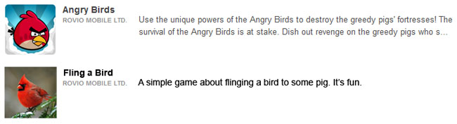 Bayangkan misalnya Angry Birds pada awal-awal peluncurannya hanya seadanya saja seperti gambar tersebut di bagian bawah, tentu calon pengguna pun akan malas mengunduh aplikasi tersebut karena cara promosi aplikasinya tidak menarik dan mungkin Angry Birds tidak akan menjadi besar seperti sekarang ini.